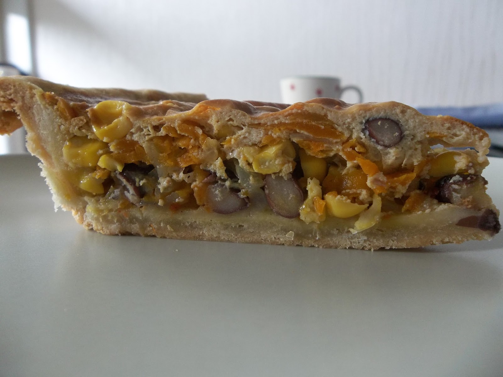 Sunshine quiche with carrot, corn, kidney beans, tahini and paprika |