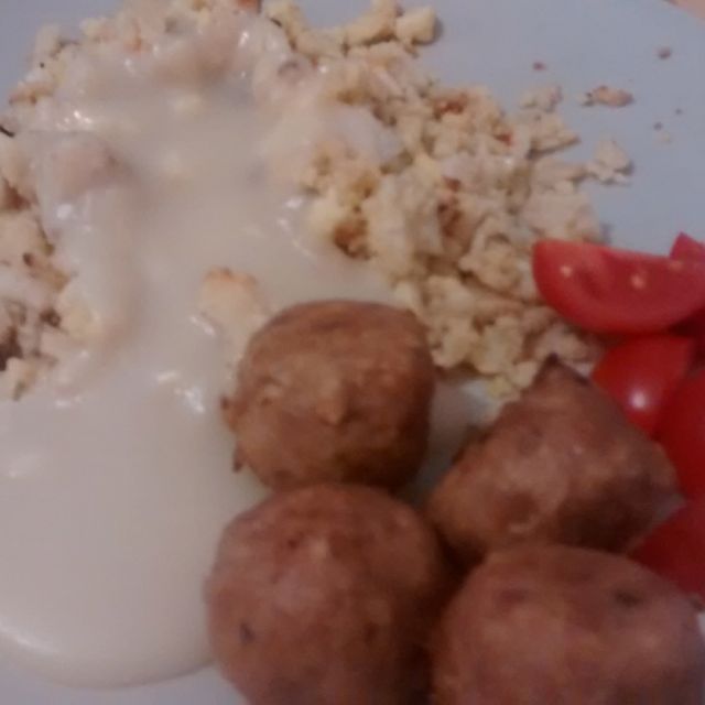 Meatballs with roasted cauliflower "rice", dairy free "cheese" sauce and tomatoes |