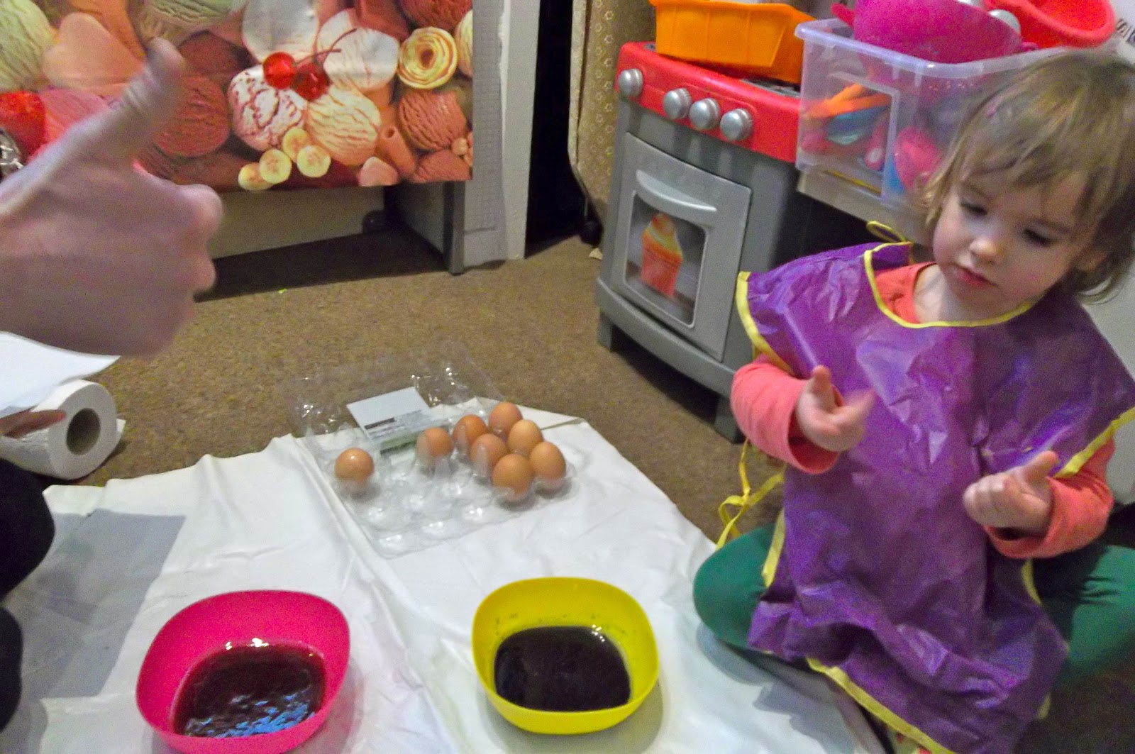 Pinny on, plastic sheet down, food colouring mixed - time to dye eggs. Thumbs up if you're ready to go... cue general thumb confusion (not from Mr E - he was clearly ready!) |
