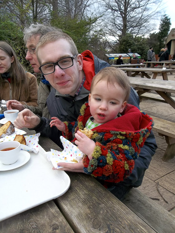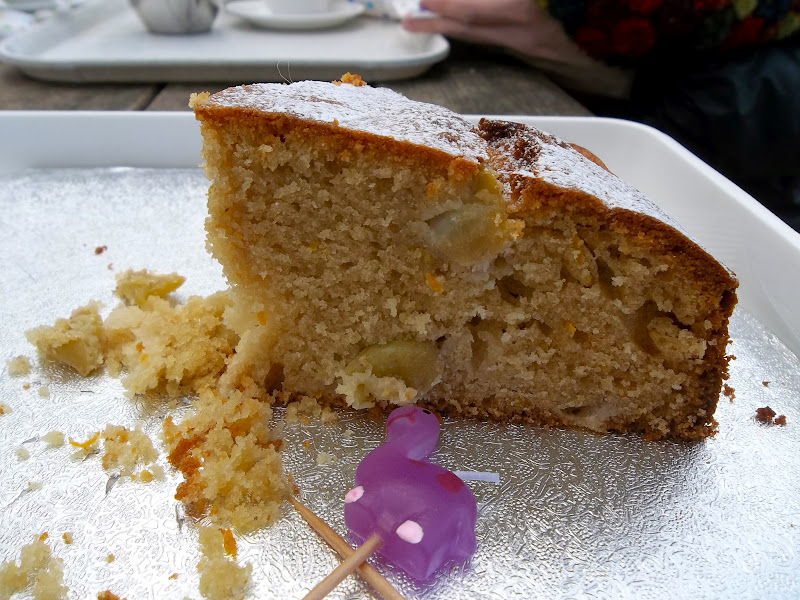 This is a robust cake - it survived being transported at a 45 degree angle under Mini-M's buggy around the Botanic Gardens and emerged unscathed to be enjoyed with a hot cup of tea in one of the first 'picnics' of the year. Shame it was a little too windy for the kitsch dinosaur candles to light - thank you Poundland!