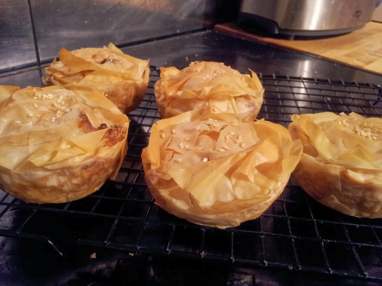 Filo pastry chicken, vegetable and houmus pies |