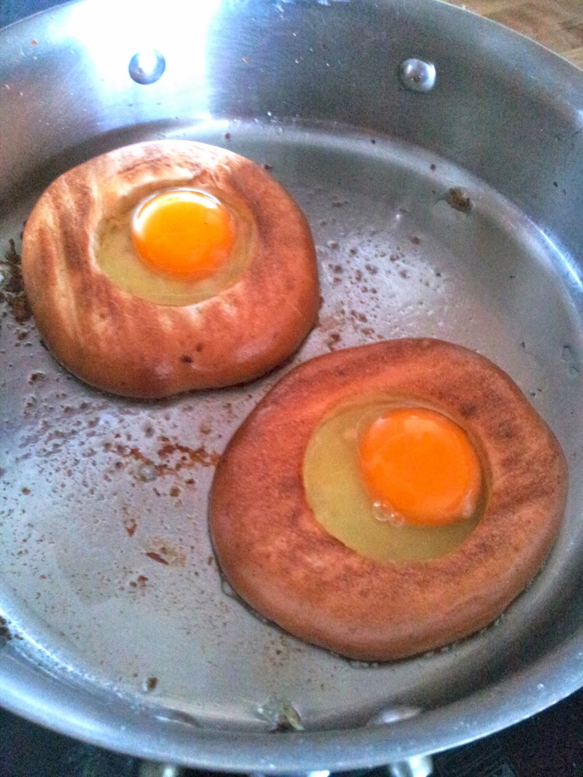 Eggs fried in bagel holes |