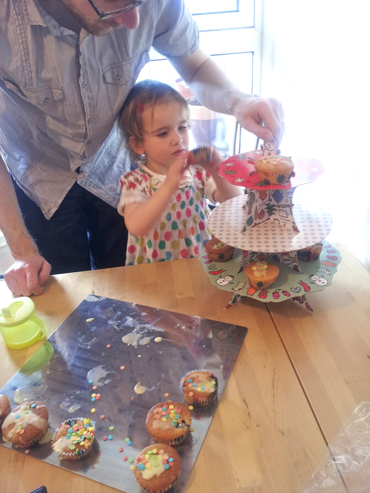 Stacking the cupcakes carefully onto the stand (after asking about 17 million times, 'are they dry yet?')