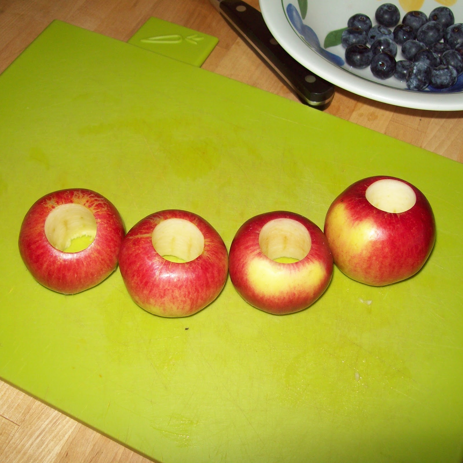 Put a couple or raisins in the bottom of each empty core, add 2 blueberries, then another 3 raisins.