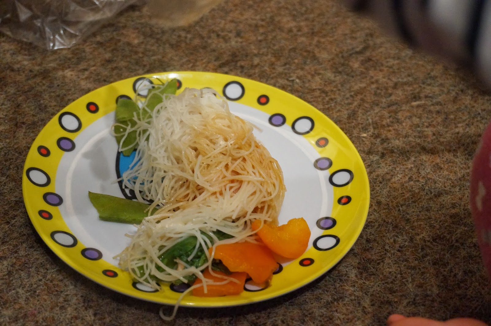 Let you kitchen pixie loose on preparing the veg. We couldn't find Mini-M's scissors so instead she snapped the mange touts and hacked at the pepper with a butter knife!