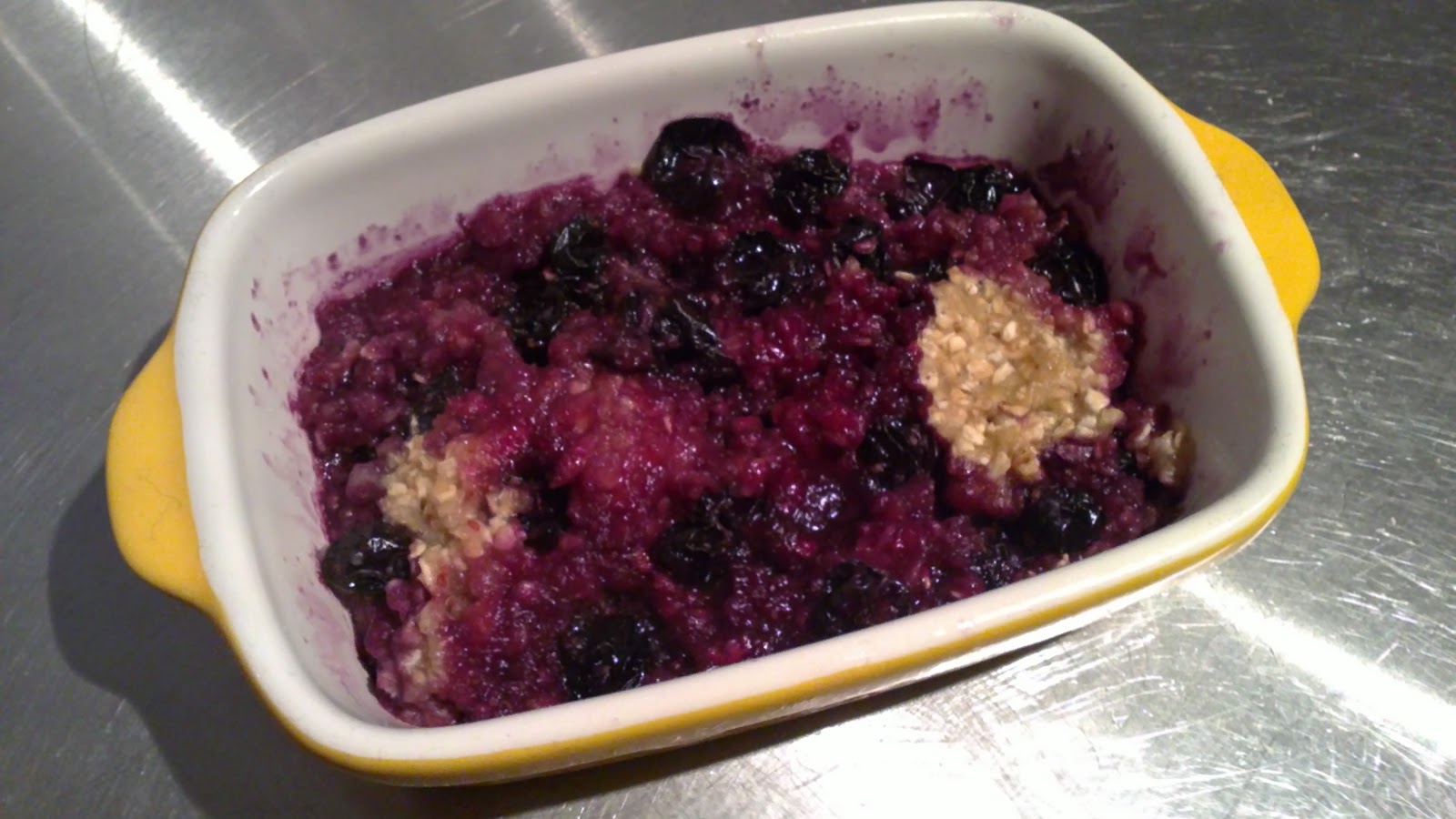 I had blueberries needing used up, so chucked in the full half cup - which made it lovely and juicy, but reduced the easy portability slightly! If you wanted to take this with you and eat it on the bus to work (for example!) where blueberry juice running down your chin isn't socially acceptably, then I'd reduce it to 1/4 of a cup. If you're at home, with a spoon, then throw them all in!
