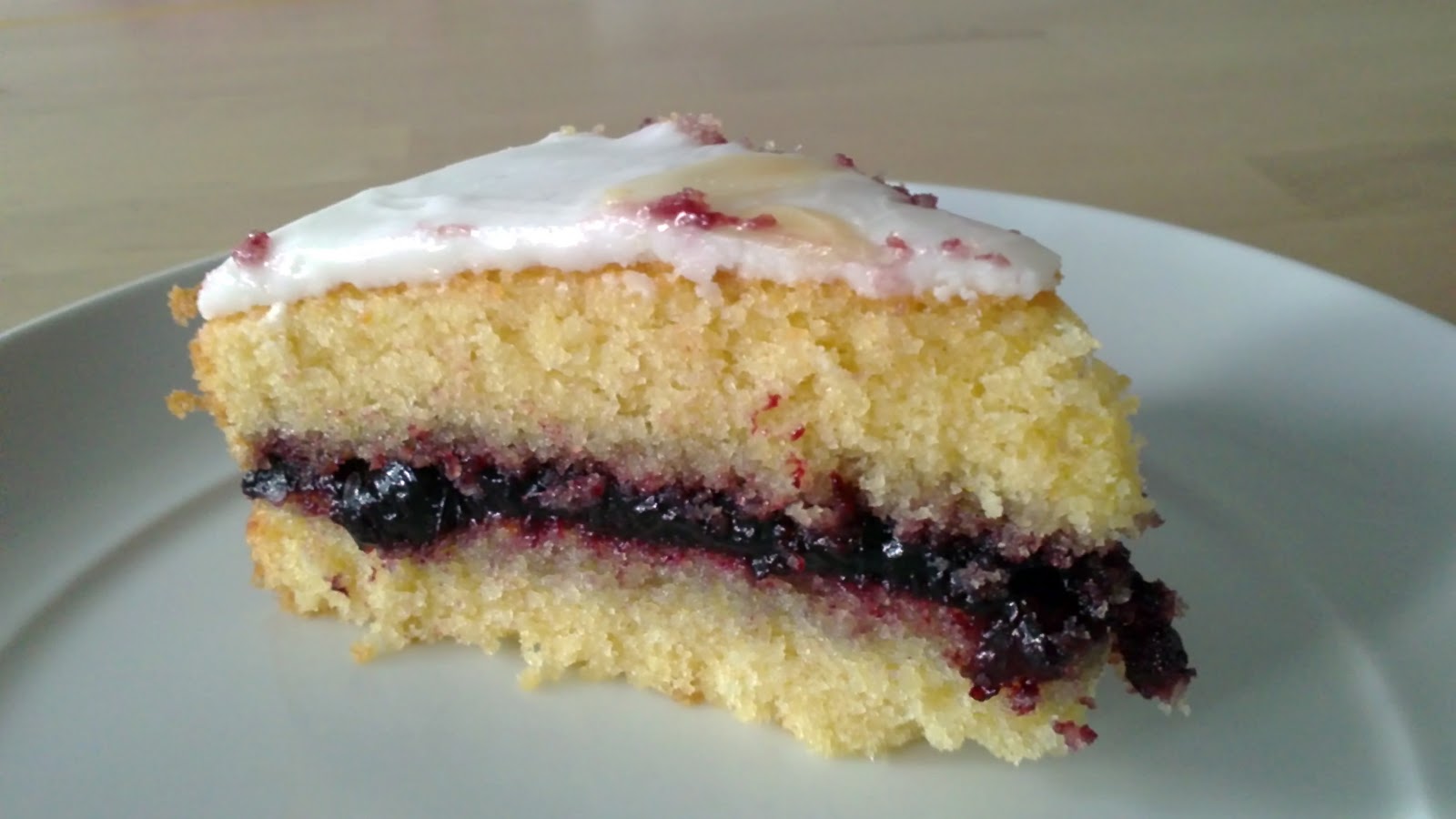 Almond sponge cake with a thick layer of black cherry jam, topped with some no-frills water icing sprinkled with flaked almonds - Bakewell Cake!