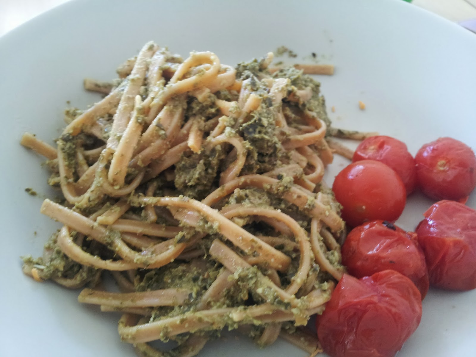 We had this mixed through dried pasta that was infused with red chili, with some baked cherry tomatoes on the side. It was really, really tasty. Mini-M remains unconvinced - however I'm planning on making it again to try to convince her - I can't let a possible vessel to convey all the goodness of greens, via a convenient pasta sauce pass us by without another shot.