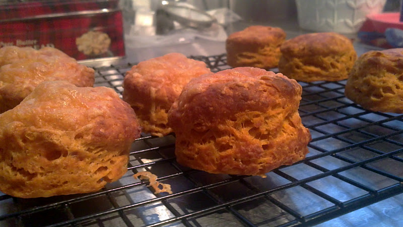 I made my first batch almost as soon as the challenge was announced, and they tasted lovely but were more than a little flat. I made two half-batches, and flavoured one with 1tsp honey and some fresh thyme leaves, using oat milk as the liquid and dairy-free margarine, and added 1 tsp poppyseeds to the other batch, dairy free margarine again, and used orange juice as the liquid. Mini-M was a fan, and didn't seem to care that they were flat as pancakes!