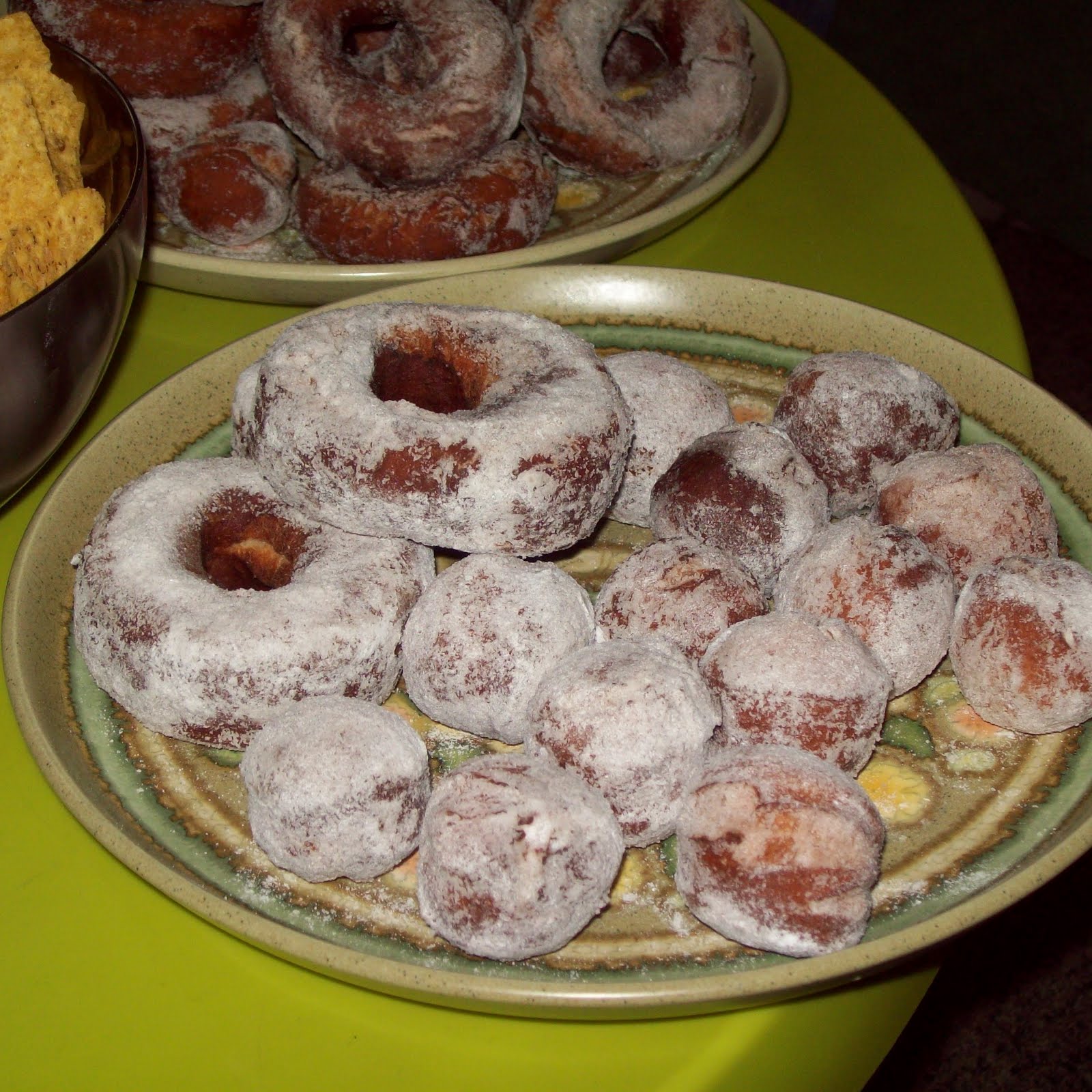 Since all the donut recipes made 20+ donuts/holes, and they are most definitely best eaten fresh, we decided to have a donut party, and invited a bunch of our friends around on 10/10/10 to celebrate the funky date, and to eat many donuts. A ridiculous amount in fact, because in the morning, my better half was concerned that we'd not have enough - so I made up another batch of dough - and all in all fried about 60 donuts and holes. Which was quite epic, but after it all, there were only 2 left. Our friends have an amazing capacity for demolishing cake!