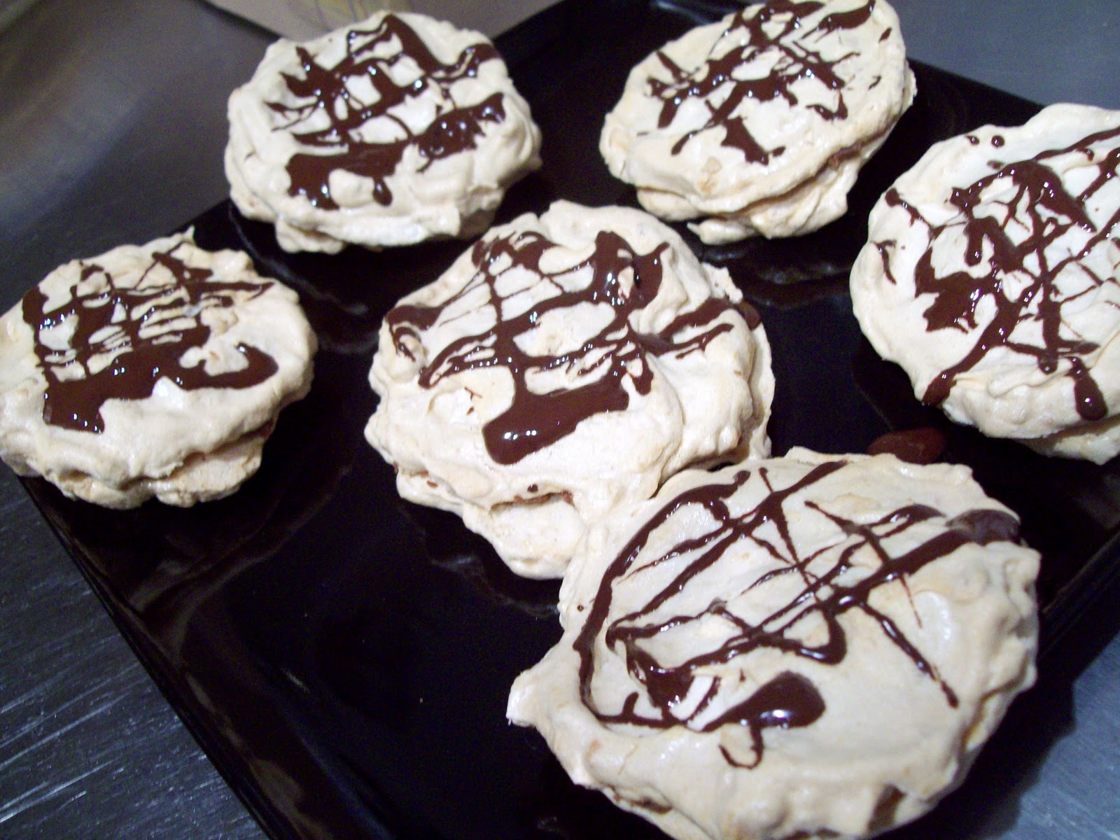 So I spread a smear of the chocolate mixture on a meringue layer, and stuck another one on top, in a kind of sans-rival meets sandwich cookie. To finish them off I drizzled melted dark chocolate on top.