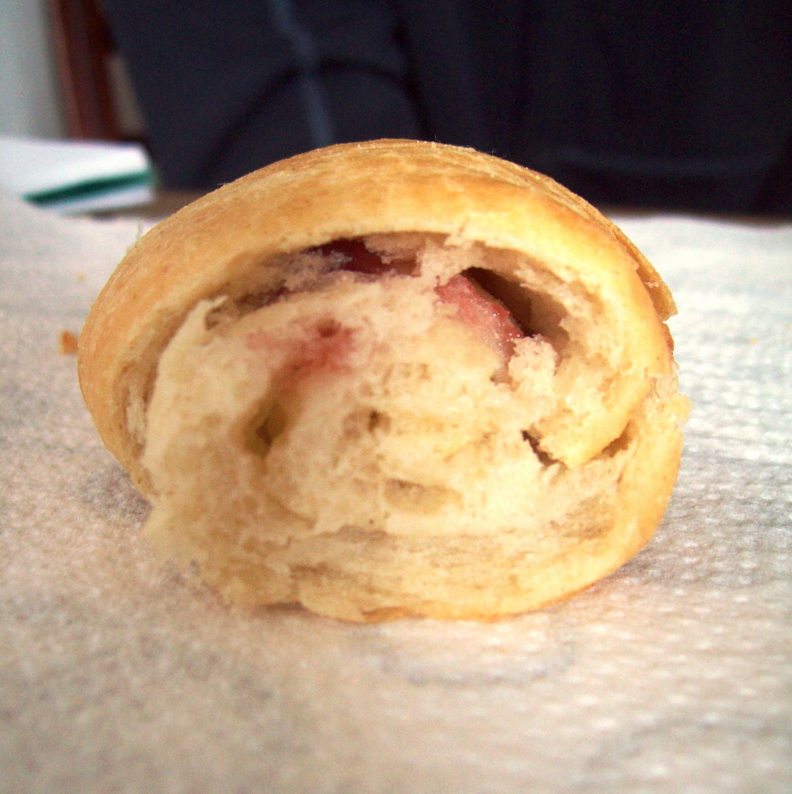 Which is probably why they didn't quite work out - they were a bit more spongy than 'real' croissants. I think that the margarine merged into the dough, rather than creating pockets of fat which leads to the open crumb texture of a croissant, the different sugar/starch make-up of the oat milk caused the yeast to act slightly differently and the rise was not the same, and finally the salt reduction will have also affected the yeast.
