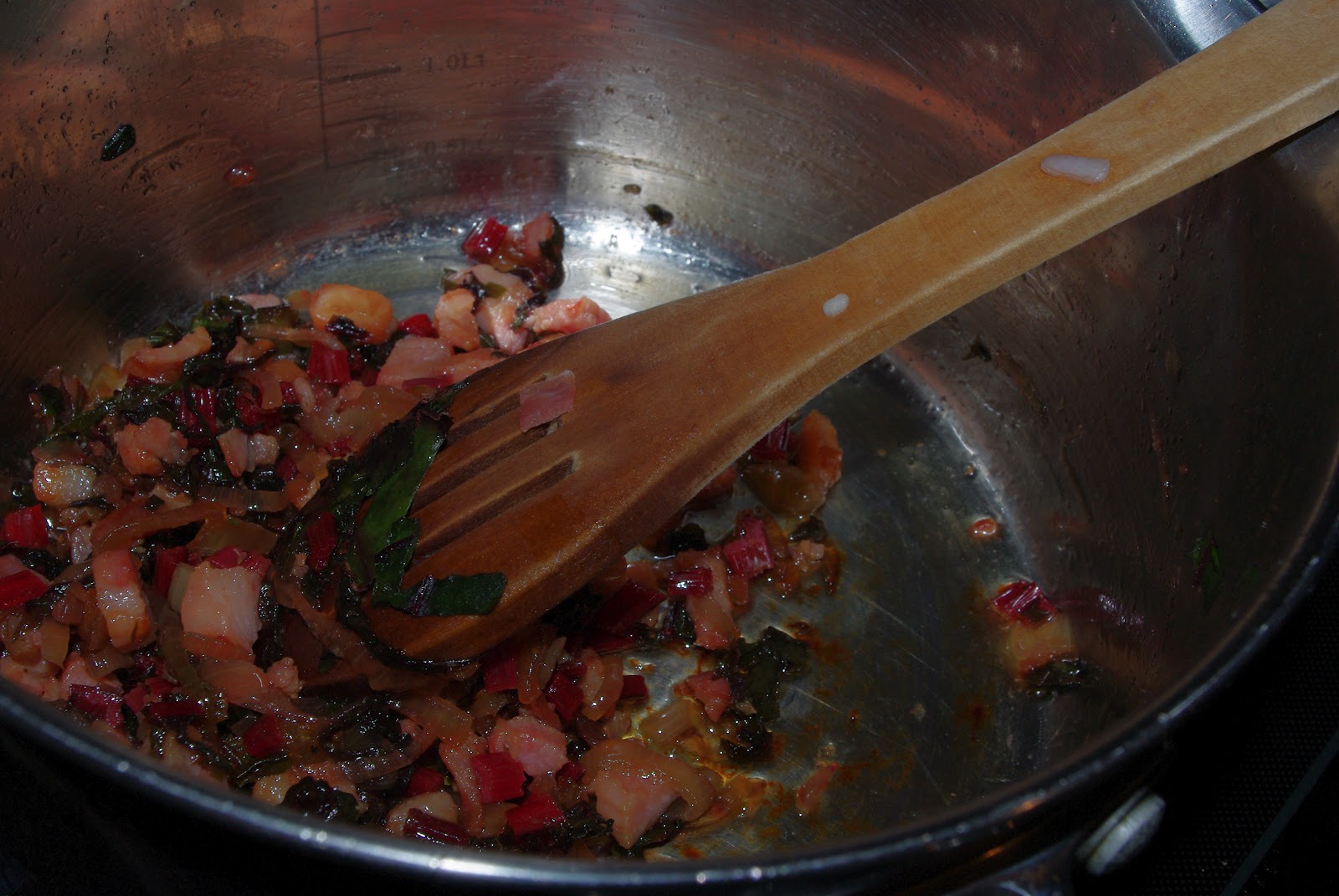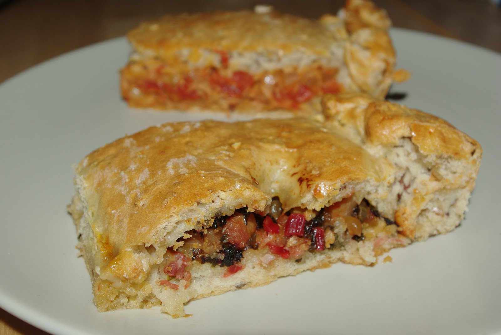 We made two fillings, and separated them by sticking both sides of the dough together to make a barrier. One was a more traditional tuna, tomato and egg version, and the other was a 'randomly using up what's in the fridge' bacon, caramelised onion and red chard version. Both were delicious!