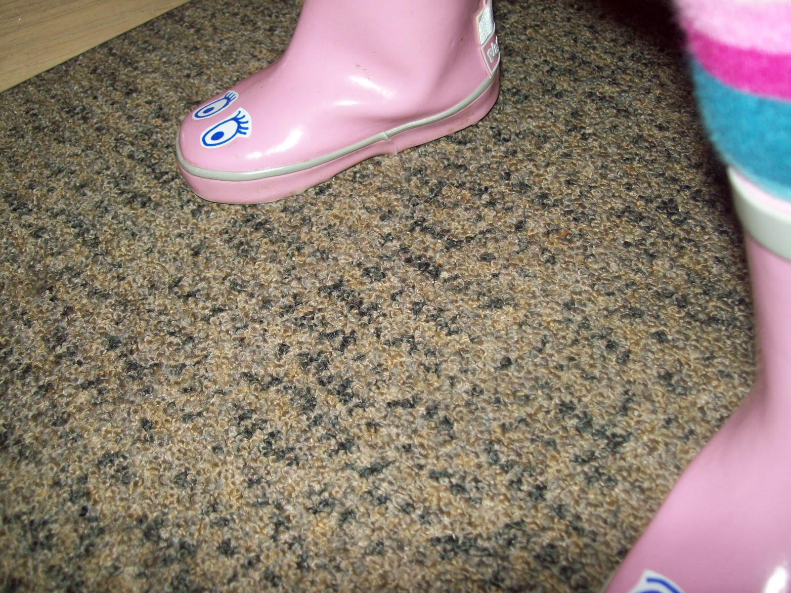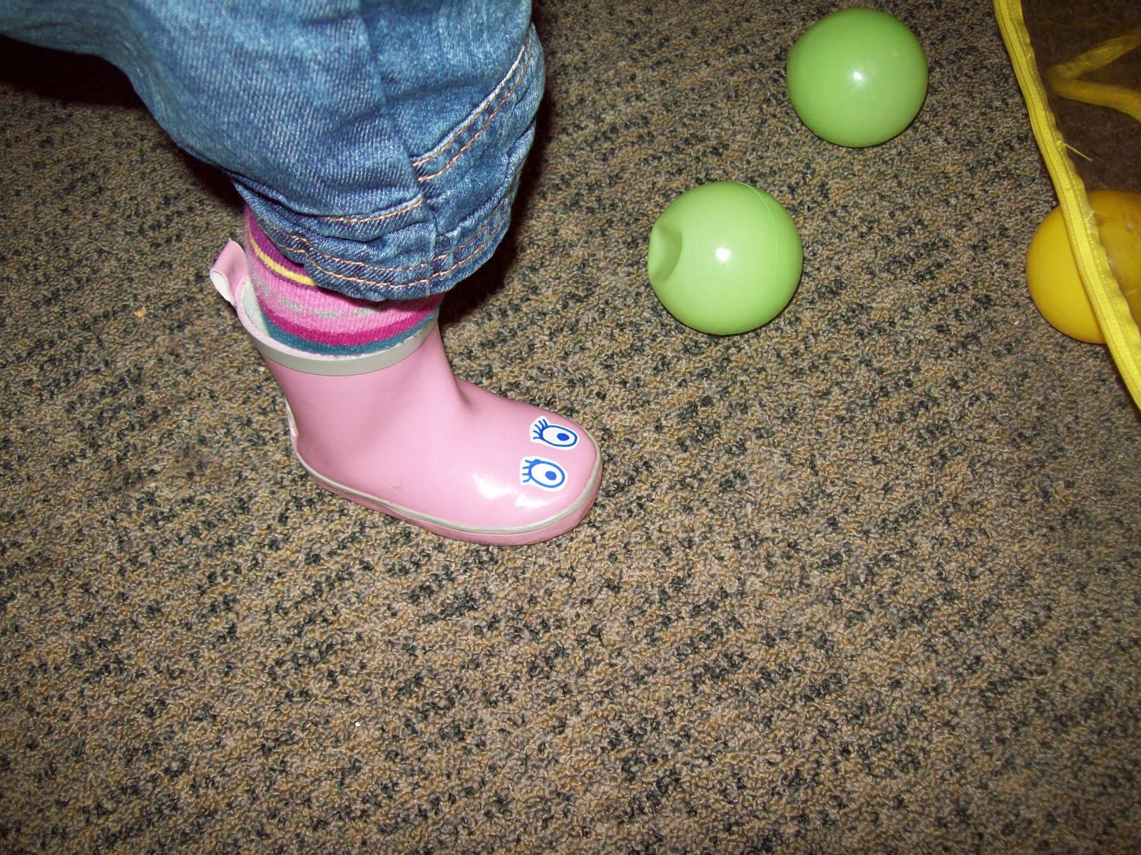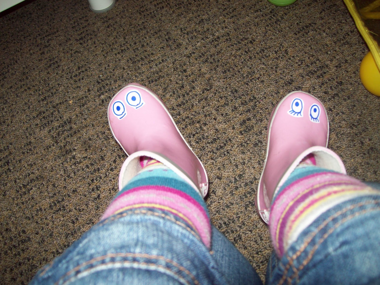 In an effort to distract her for a while with something new, I made some sticky eyes (with some blank labels, a blue Sharpie and a pair of scissors) for her wellies - since she was toddling around the living room clutching them and shouting foot.