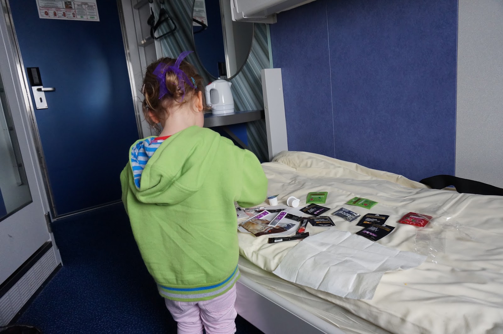 On the boat eventually, and the in-cabin tea and coffee sachets provided a good hour of pre-bedtime entertainment for Mini-M.