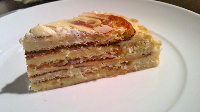 To celebrate, I made a Hungarian style layered pancake cake. It its made from 4 pancake layers, which are made with whisked egg whites to make them a bit lighter and puffier, sandwiched with ground almond filling, and topped with soured cream (or in this case, plain soya yoghurt) and then baked in the oven.