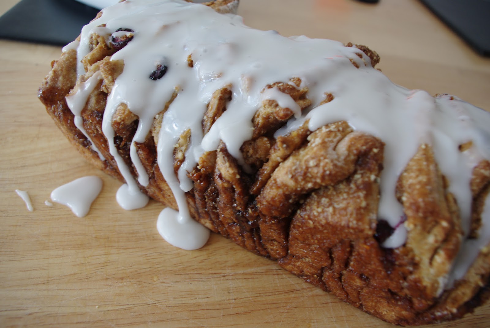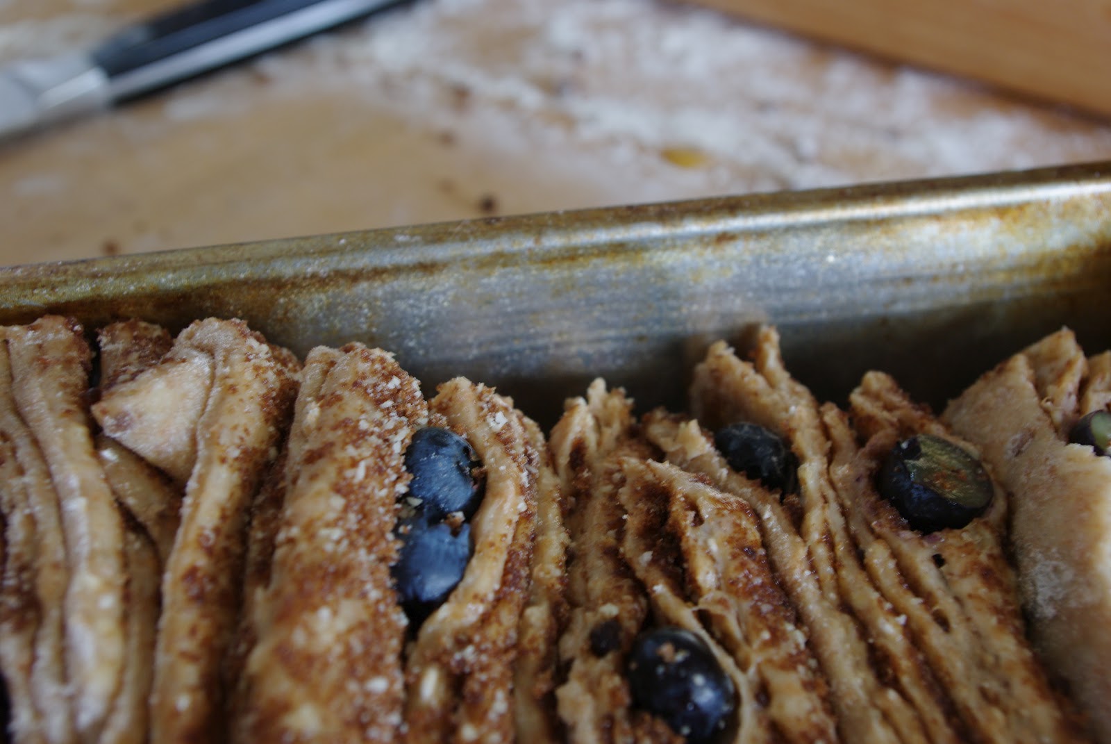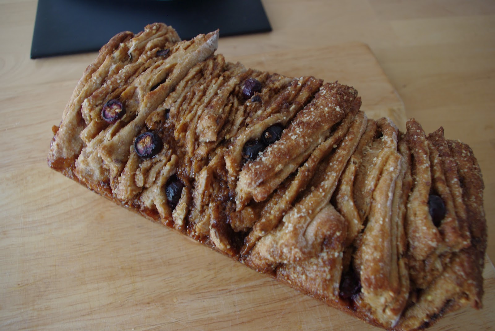 Whilst it may be catchy moniker, Identity Crisis Bread is fairly unhelpful in the description stakes, so let's call it Wholemeal Almond Blueberry Pull Apart Bread. It's wholemeal bread, layered with cinnamon, sugar almond and blueberries, baked and drizzled with almond icing.