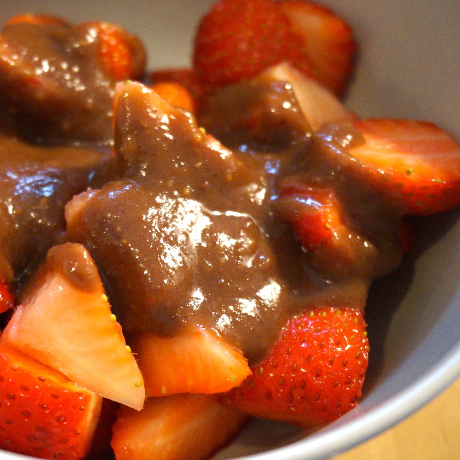 And in that vein I bring you… strawberries and chocolate peanut butter sauce! Oh yeah.