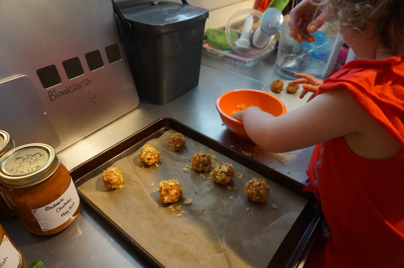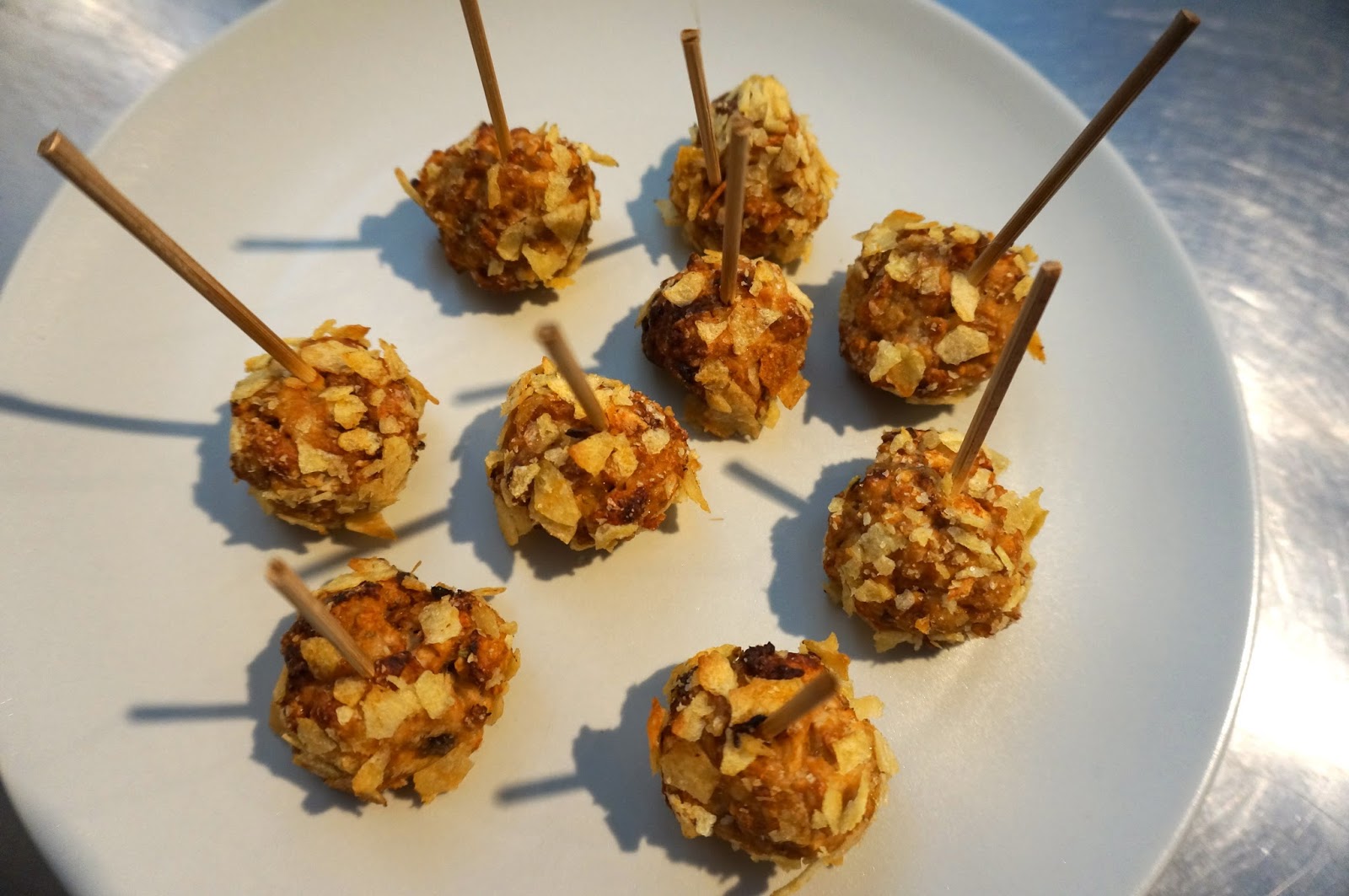 - Crush a packet of plain crisps and roll the balls in the crisps.