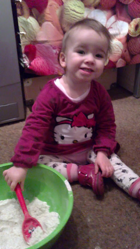 Sieve the dry ingredients into a bowl (I have to confess I didn't sieve). If you have a little kitchen pixie helping you, then it is essential to stir it after every addition, including the first one. Vigorously. With a lot of spoon waving and many cries of 'keep the spoon in the bowl!'.