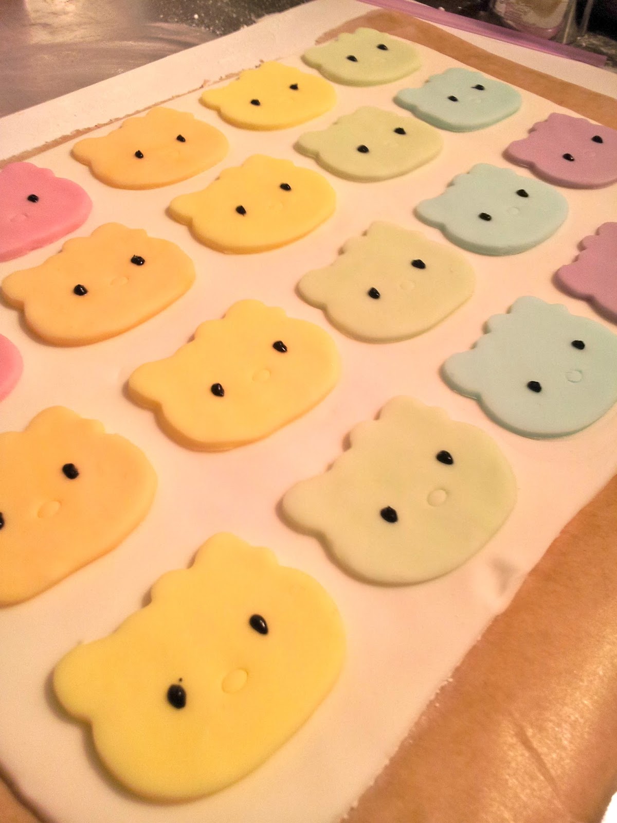I used a Hello Kitty biscuit cutter to stamp out 18 faces in pastel rainbow colours of fondant, which I had coloured up in small amounts using gel colour. Mr E was even roped in to help with the kneading.