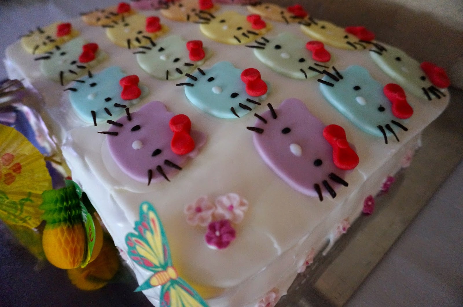 Because I was using meringue frosting, I put all of the Kitty heads on a thin sheet of white fondant, as I couldn't ice the cake until the morning of the party, but didn't want to have to do any fiddly stuff then. Unfortunately I cracked one side whilst putting it on the top, right in the middle at the front :-( but it wasn't too obvious once some cocktail umbrellas and paper pineapples were added!