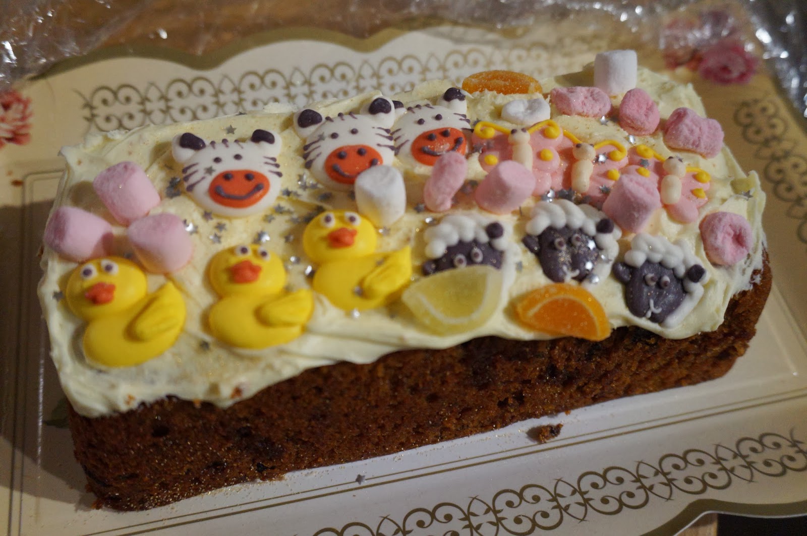A thank you cake: When she ran out of animals, she requested marshmallows and orange slices to fill in the remaining blank spaces. Then added glittery stars.