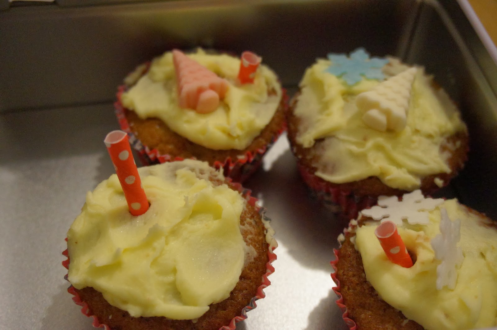 North Pole cupcakes with wafer snowflakes (and unfortunately yellow snow - a side effect of having to use dairy-free margarine!)