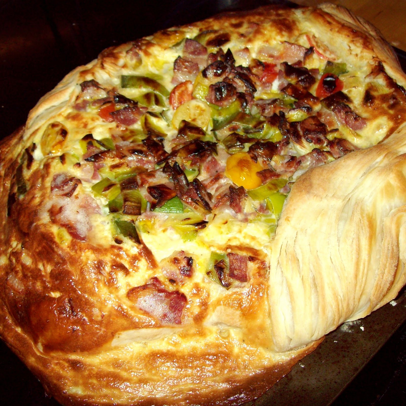 Leek, bacon and egg puff pastry freeform pie |