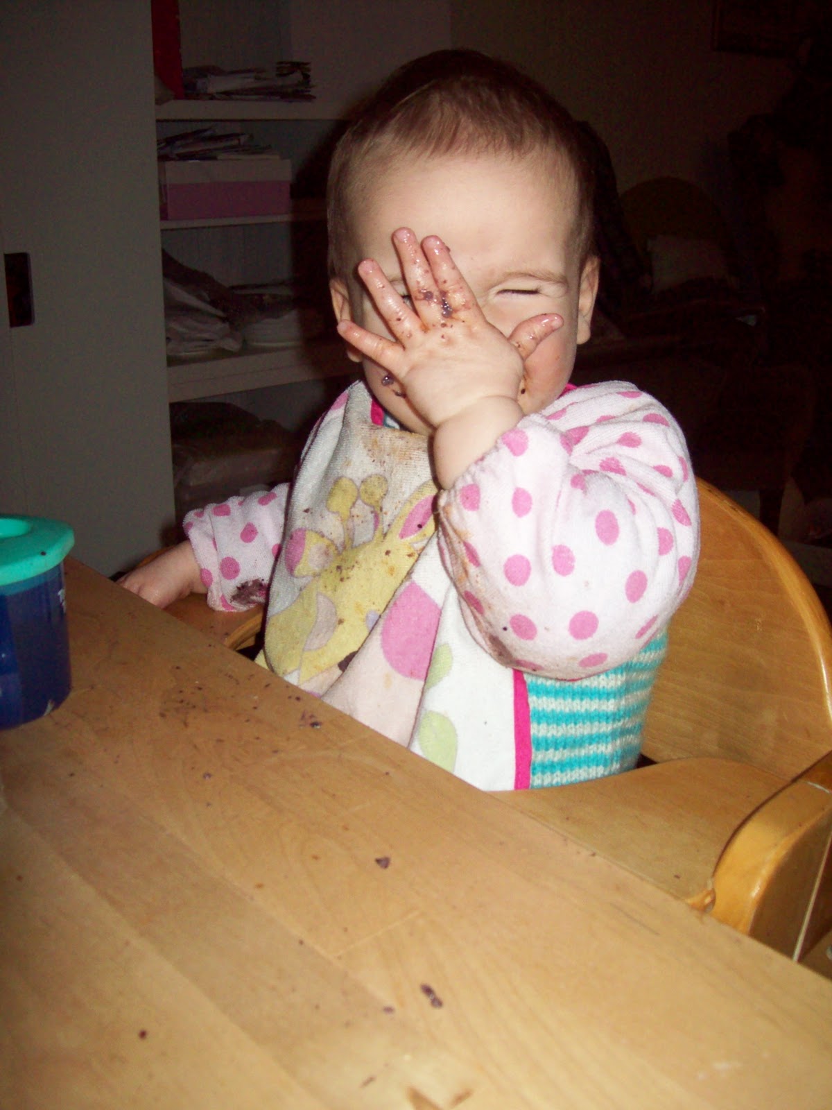 Mini-M's new mannerism - hand to face when something is funny or silly. Cute but messy immediately after blackcurrant jelly... didn't get a picture of the moment she took her hand away unfortunately!