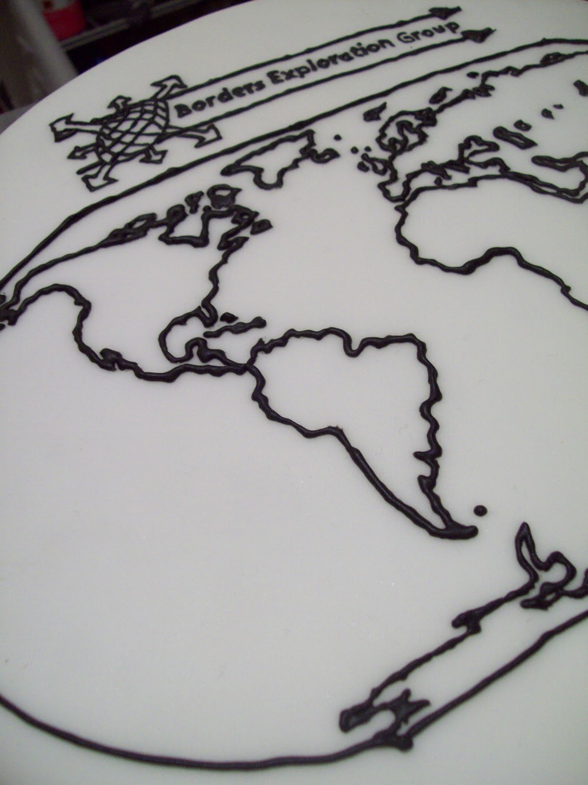 Cake in progress - for the Borders Exploration Group's 20th Anniversary celebrations. The world is REALLY wiggly when you try to ice it. Particularly northern Canada and South East Asia. I may have significantly altered continents....