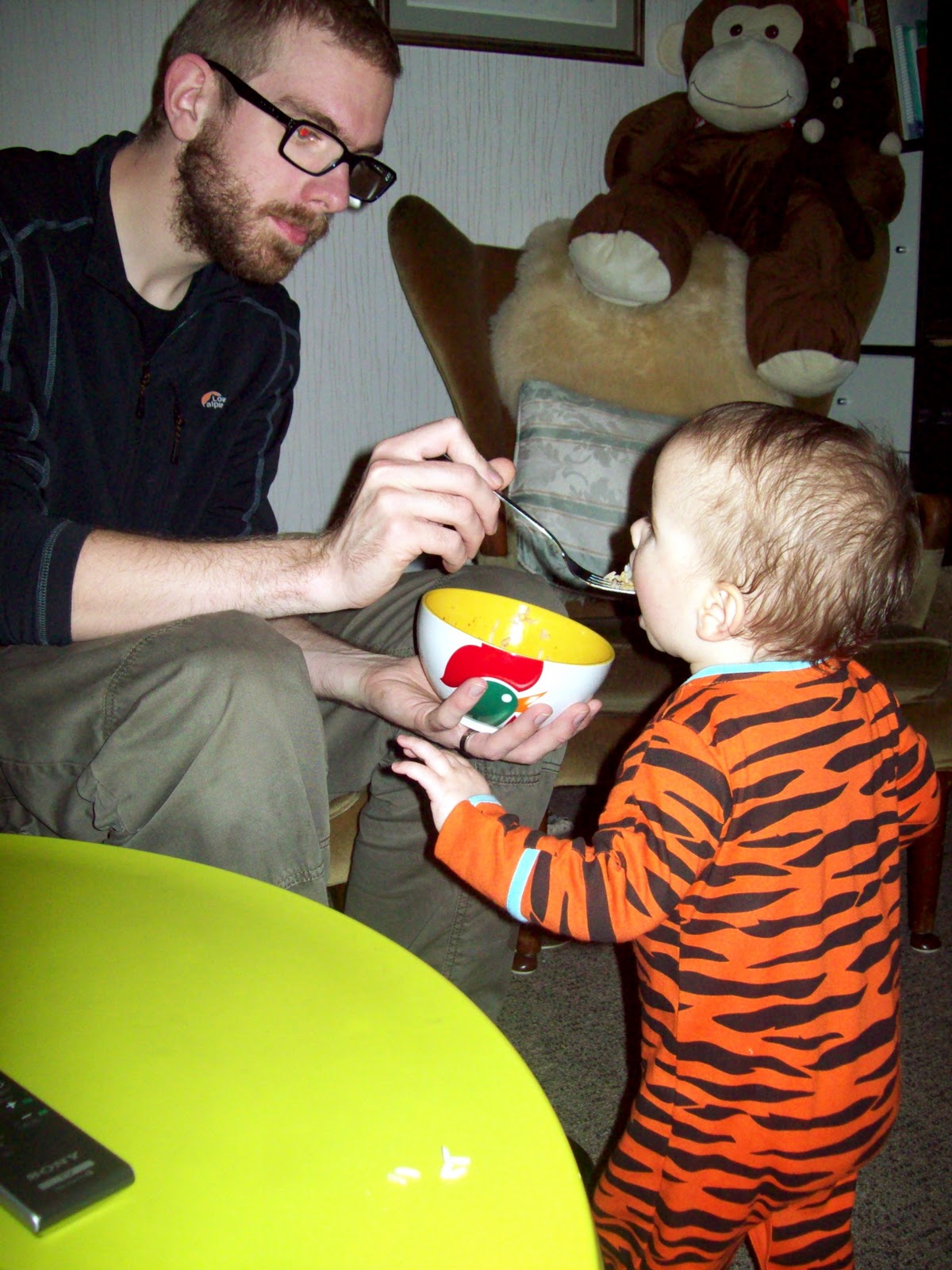 Mini-M decided that despite having had her tea, play time, bath time and tooth brushing, it was time to try some of Mr E's Thai basil chicken. Which she seemed to enjoy, even though it was quite hot and spicy - and this from the girl that seems to sometimes exist on just bananas and toast! And yes, we do regularly eat our tea out of cereal bowls...