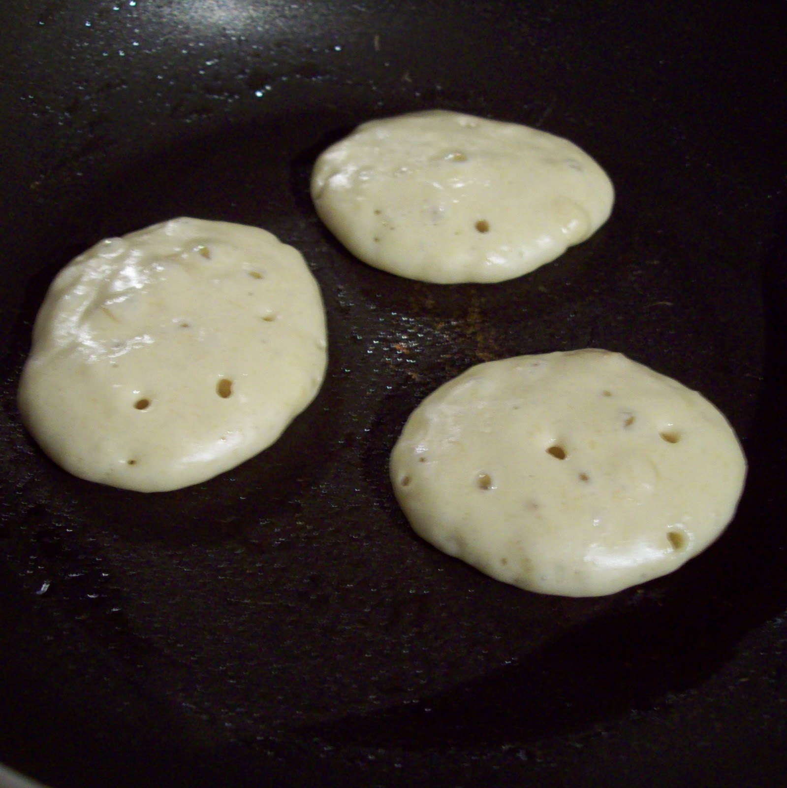Dollop spoonfuls of the mixture into the pan and allow to cook for about 3 minutes until small bubble just start to appear on the surface, then flip them over carefully and cook for about a minute more.