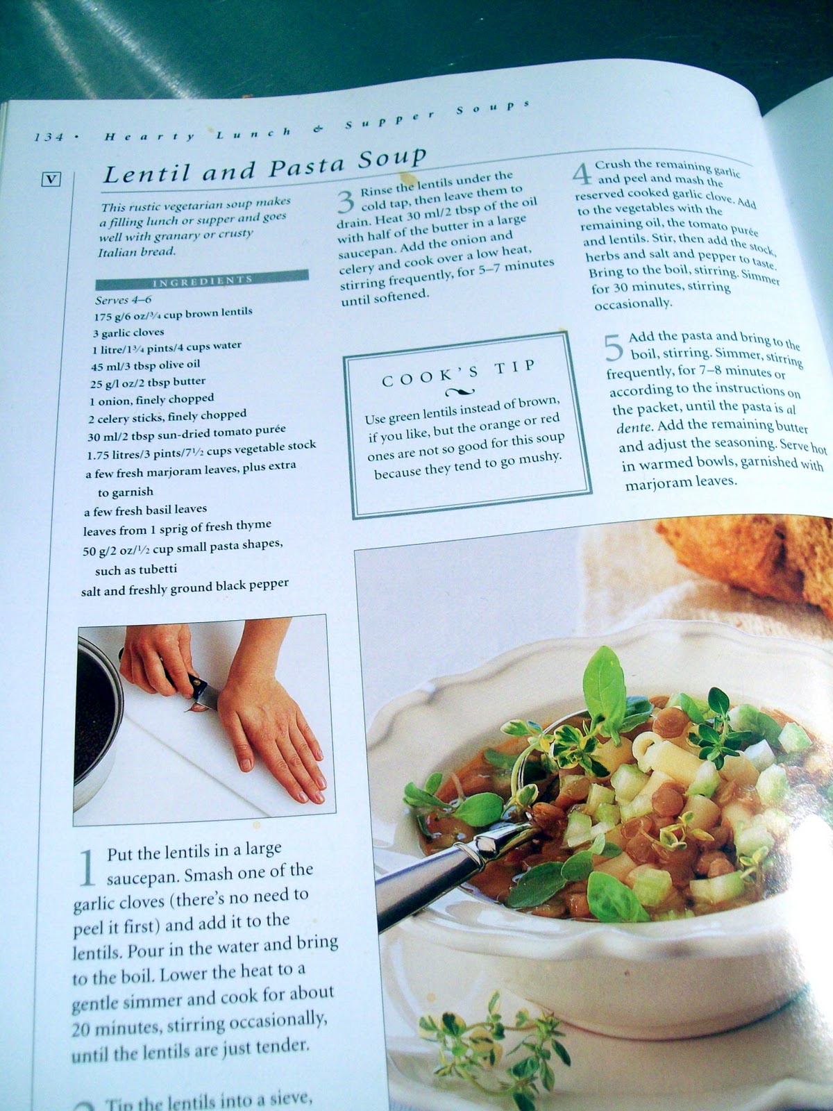 Secondly, I rejected my first random soup recipe! Shocking I know. It was chosen my Mini-M who decided to open the book and stand on the page for Roasted Red Pepper Soup. My book will automatically open at that page now for evermore. I a) don't like roasted peppers, b) didn't have any peppers in the fridge and c) didn't like going out to buy an ingredient to turn into soup I knew I wouldn't like. So I got Mr E to chose me one instead - I flicked through the pages and he shouted stop. He chose me Lentil and Pasta Soup, which I miraculously also had most of the ingredients for - good choosing Mr E!