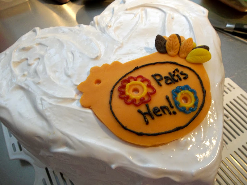 I made a fondant hen decoration for the top, with some orange, brown and yellow fondant which I decorated with some writing icing.