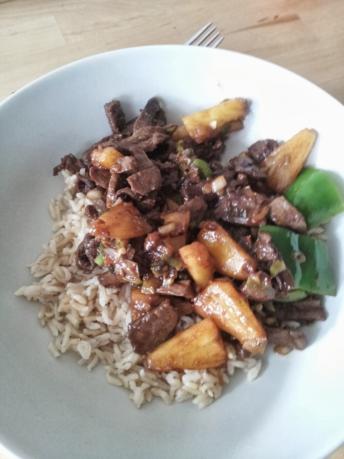 | Beef, pineapple and green pepper stir fry with brown rice |