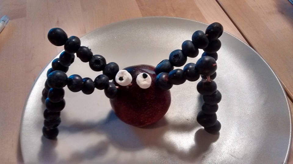 "Spider" (it's missing a few legs, the plum wasn't very big!): Plum, blueberries on cocktail sticks, marshmallows on halved cocktail sticks with black icing eyes.