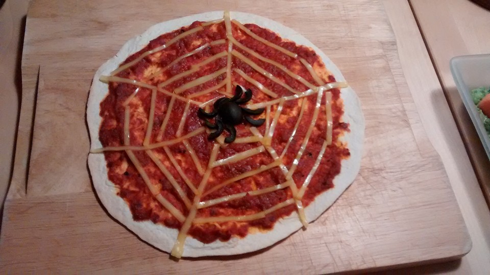 Spider-web pizza: Tortilla wrap, tomato sauce, dairy free cheese, black olives