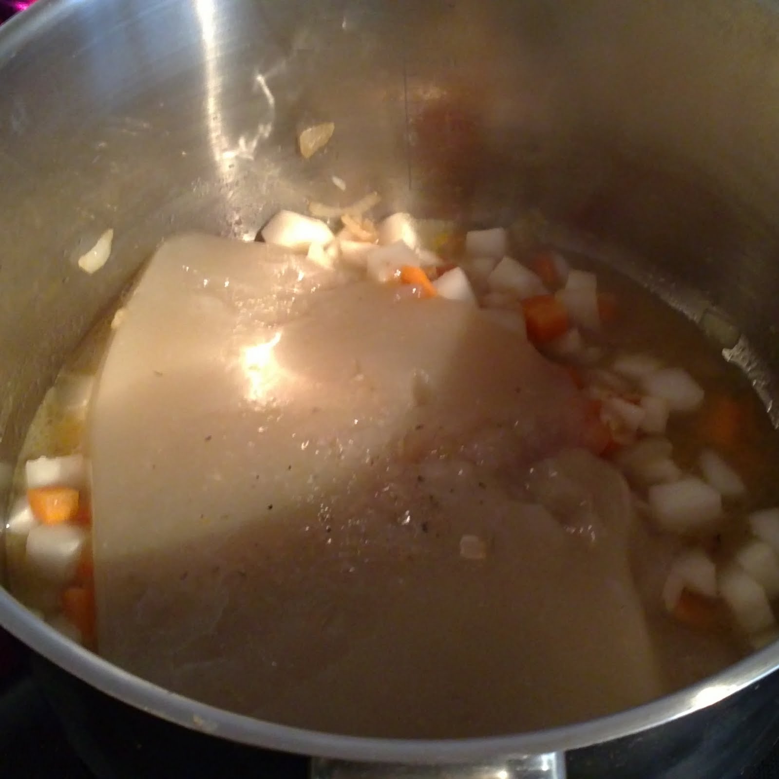 I took my frozen jellied stock out of the freezer and broke it into chunks then resisted the urge to prod it whilst it defrosted. I had to do it out of the fridge in the end, because our fridge is uber cold, and Scotland is not really very warm, so even out of the fridge it defrosted very slowly!