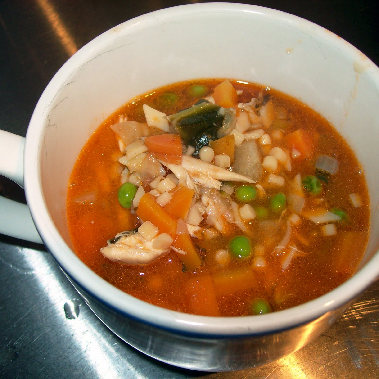 Once I was more organised, I got stuck into the challenge in earnest, and got some chicken wings to make stock. I used chicken wings, fennel, carrot and turnip, bay leaves and thyme. I strained it and kept a portion aside to try the gelatine freezer consomme, and left the rest to cool. It set nicely jellyish, and the next day, I used it to make a summer "minestrone" with chicken (picked from the stock wings) fresh peas, carrots, small turnips (not the mushy stock ones, although we did use them to make some awesome stovies), tomato paste, soup pasta, red pepper and greens. It was delicious.