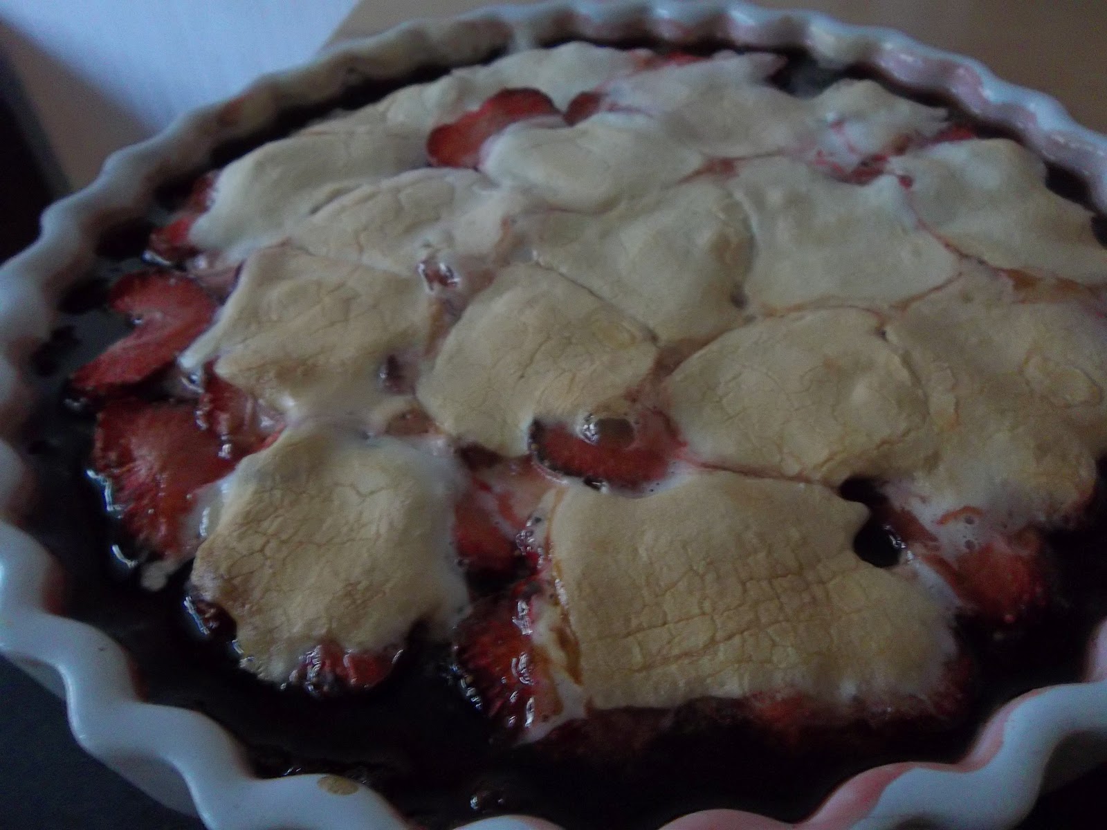 And some played a starring roll in a hastily invented Chocolate Brownie Strawberry Marshmallow Tart. Mr E had invited friends over to watch some Bond - he's attempting to watch all 22 in sequence before 23 is released - and just as I was about to start making dinner, we discovered there were some allergies amongst our soon-to-be-arriving guests that I'd been unaware of. One of them being eggs. So out of the window went the gooseberry meringue pie I'd been planning! And with some inspiration from this White Chocolate Toffee Brownie Tart at What Katie's Baking, I soon had the tart in the oven and my fingers firmly crossed that it would come out OK. Thankfully it did - phew!