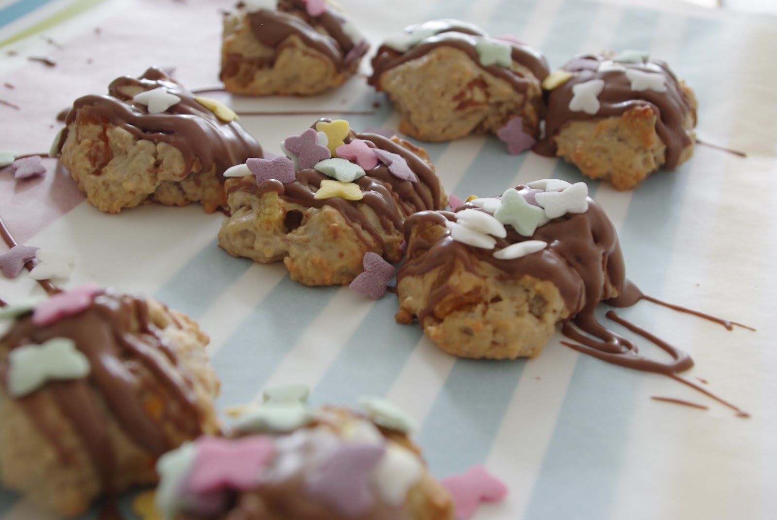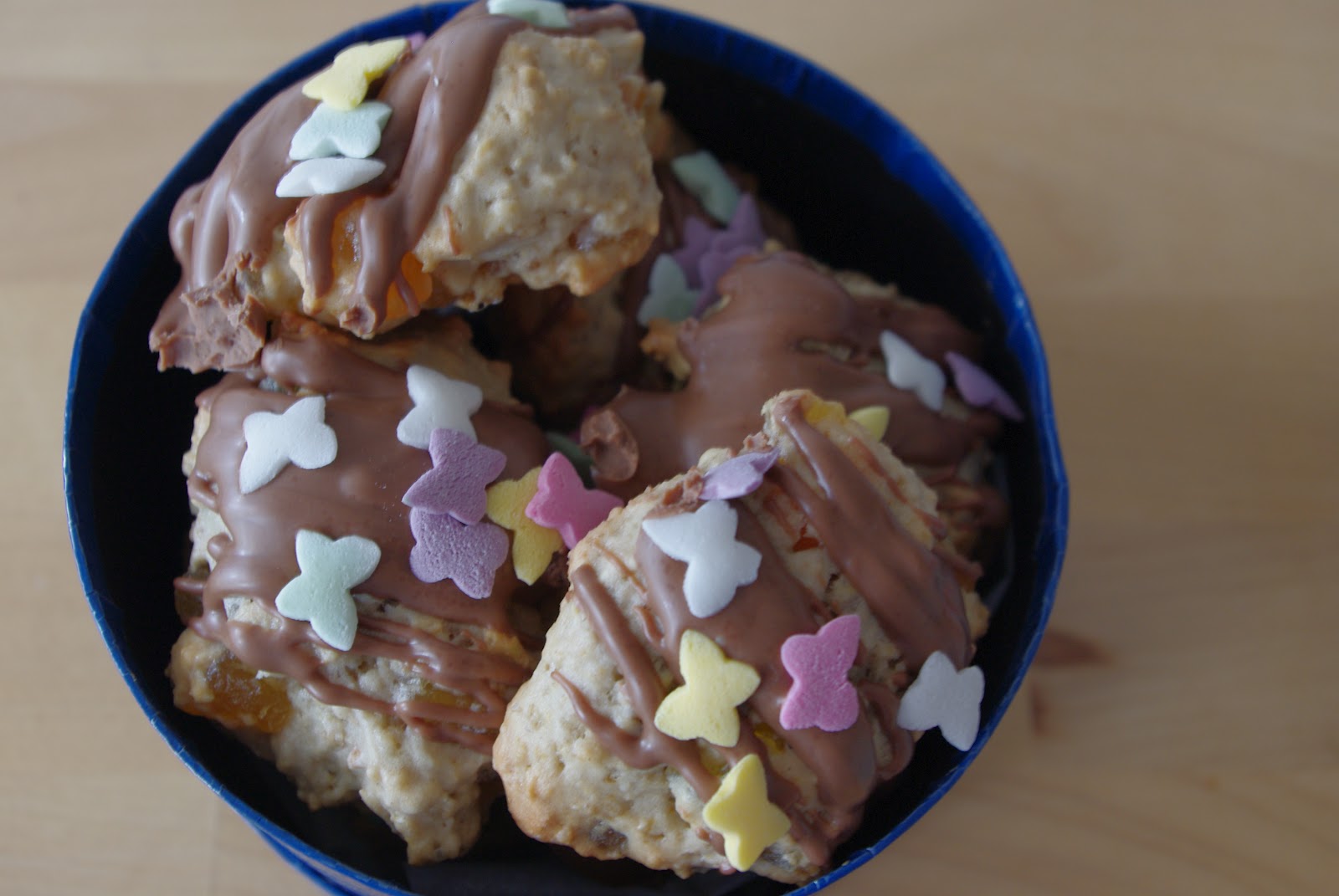 I then randomly picked a recipe, which turned out to be 'Cherry & Oatmeal Cookies' from page 201 in the Wholesome Cookies section. Since I didn't have dried cherries in the cupboard I immediately headed off piste, and what with having to adapt it to being dairy free, I'm pretty sure what I ended up with was a fairly long way away from what the original recipe would have created. But please forgive them (and me) because at least they turned out pretty!