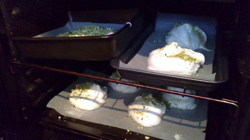The recipe directs you to roll the meringues carefully, using two spoons, in the chopped nuts. My nerve failed me at this point - after the boiling sugar success, I didn't want to push my luck, and since I needed them to turn out well for the auction, I went for the safe option - I dolloped them onto my greaseproof paper, then sprinkled the nuts over the top.