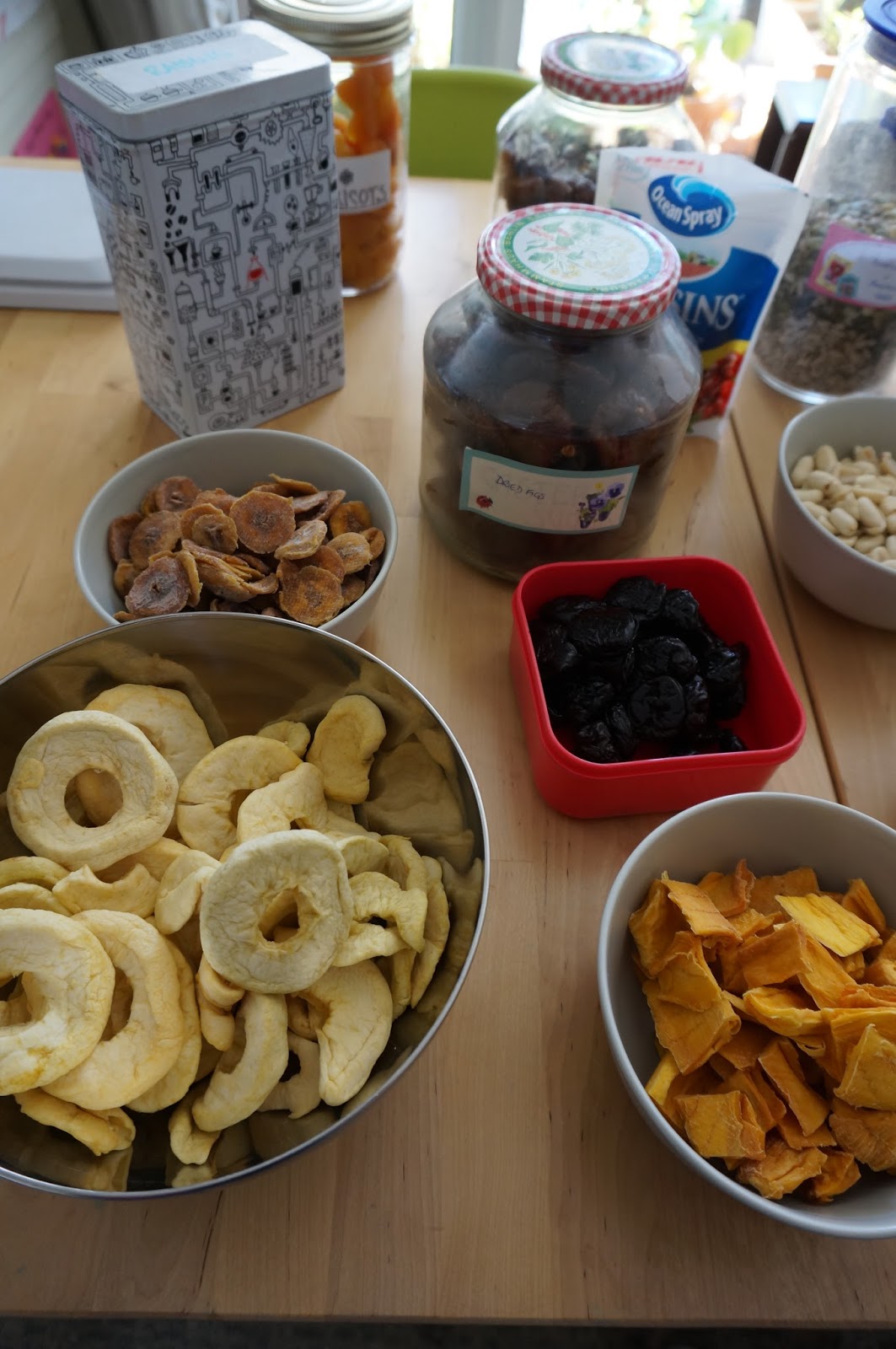 The fruit choices: apple, mango, prunes, banana, figs, dates, raisins, apricots, cranberries |