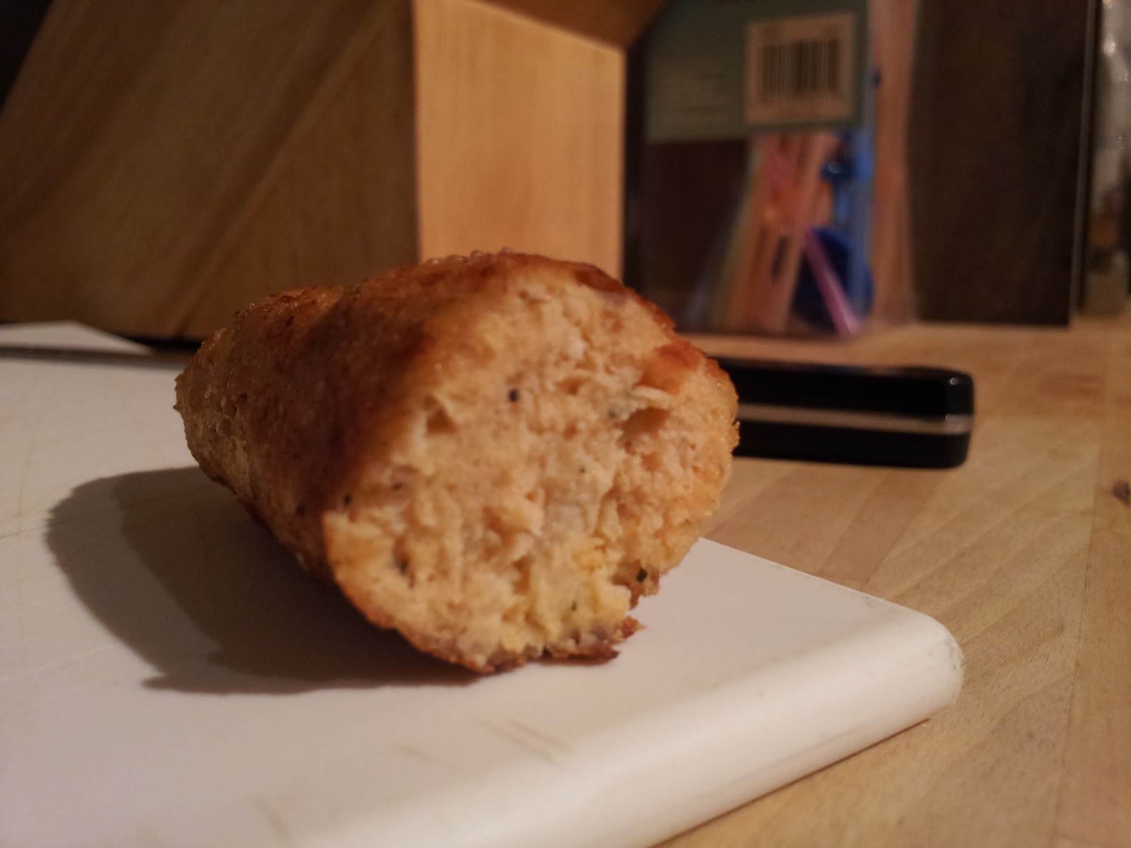After mincing salmon, onion, egg, breadcrumbs and dill, the mixture was formed into sausages, wrapped carefully in cling film and poached for 15 minutes. |