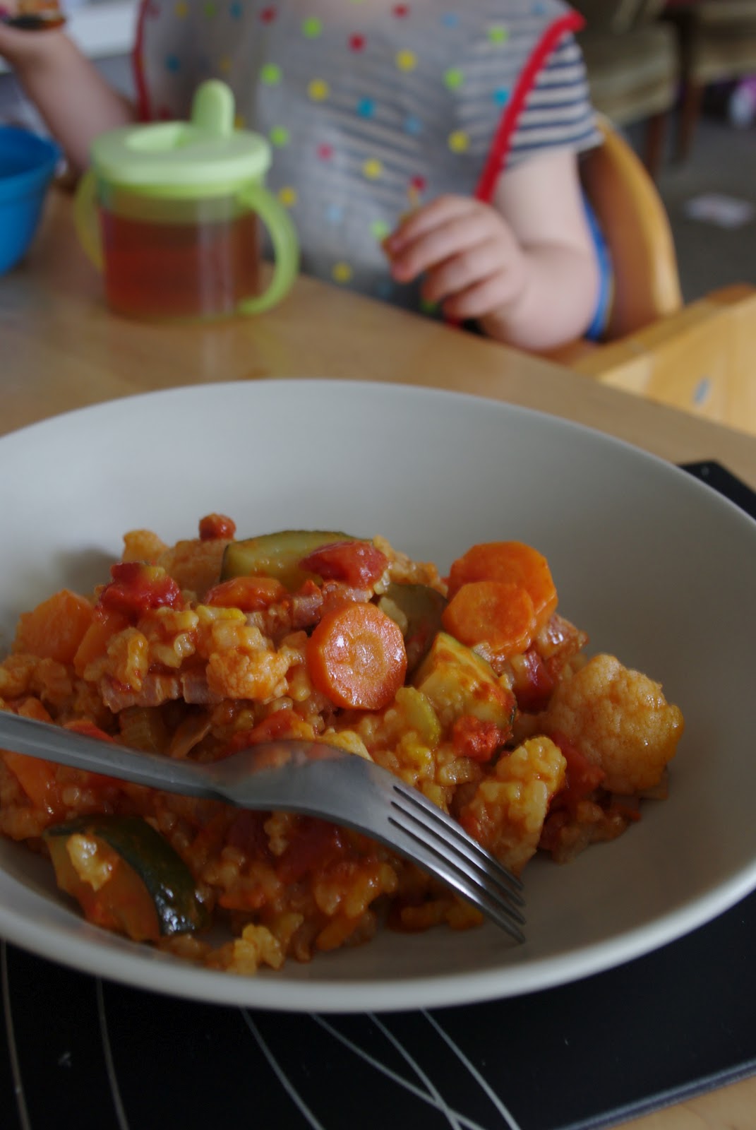 I'm really not a big fan of seafood, so I followed the veggie paella recipe, using up the goodies from our weekly veg box from East Coast Organics - carrot, courgette and cauliflower.