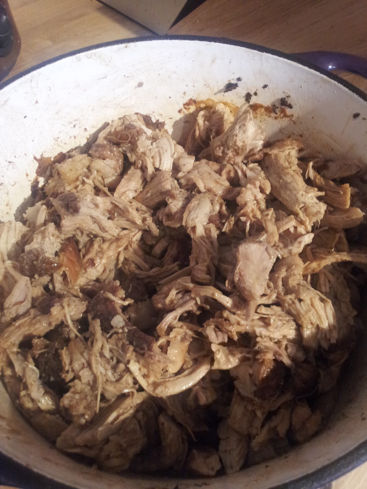 Anyway back to the pork. The good news is I didn't drop it! So it survived unharmed, and Mr E bunged it in the fridge once it had cooled enough. The next day, I was able to pop it back in the oven with all the juices, then once it was heated through again, shred it.
