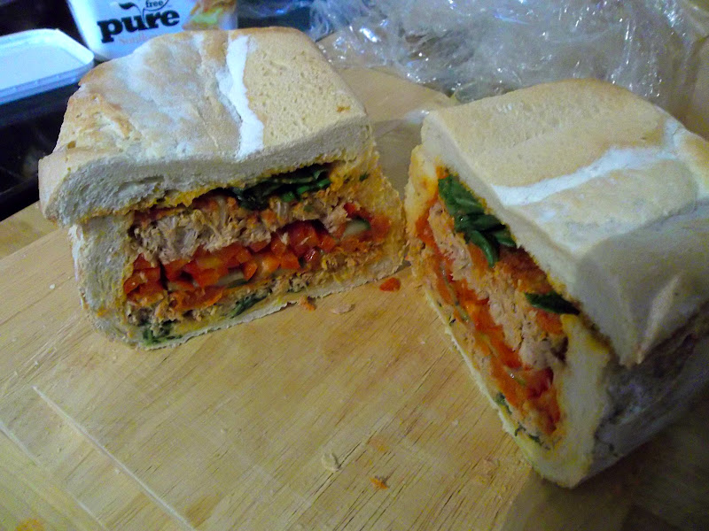 It's a great picnic food (just make sure you use a round crusty loaf that you can serve cut into wedges, rather than my makeshift crusty farmhouse, which made eating it complicated and messy!!!). You could literally stuff it with anything. Grilled courgette or aubergine would be fantastic. Mozzarella. Salami. The key is that you make it the day before you want to eat it, to allow the bread to soak up the juices, and that you wrap it tightly to help it stay together.