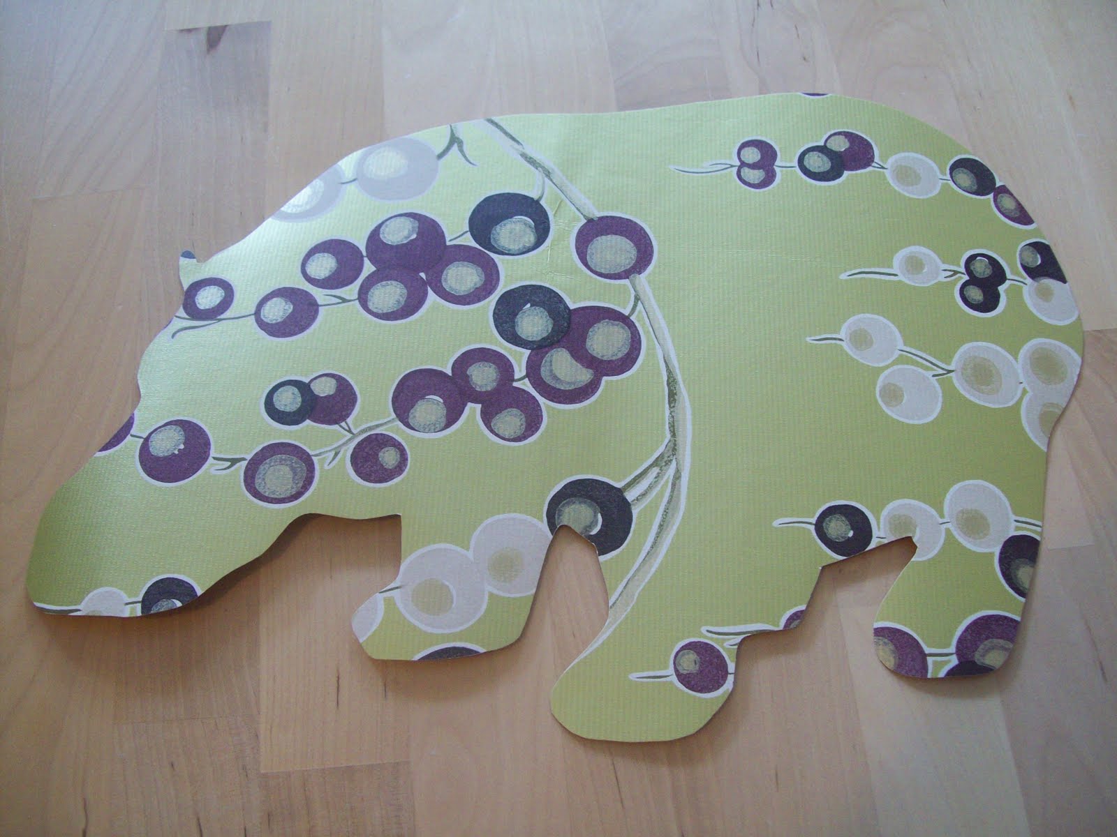 First of all I printed out some animal silhouettes that I downloaded from fun-with-pictures.com. I then lightly glued them with a few tiny dabs of paper glue onto the wallpaper samples, cut around them with scissors, and peeled the prints off again.
